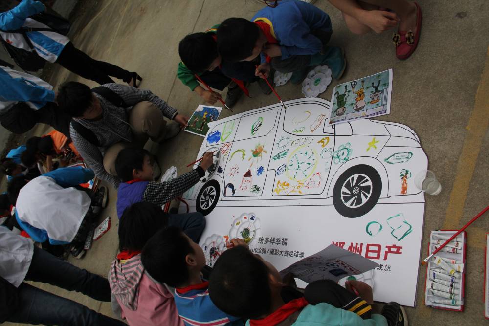 除了捐贈物資,活動現場還設置了汽車知識有獎問答、兒童車型涂鴉、3D電影播放等環節,給孩子們帶去前所未有的新奇體驗,開闊了孩子們的眼界和認知。兒童車型涂鴉環節呼應鄭州日產“一點色彩,繪多樣幸福-NISSAN NV200涂鴉大賽”活動,通過現場分組讓孩子們與愛心車主共同協作,在NV200 CVT車身板上描繪心中的足球賽,展示童年的多彩夢想。而3D電影的播放則讓孩子們感受到了高科技的魅力,新鮮有趣的的情節惹得孩子們一陣陣歡笑。