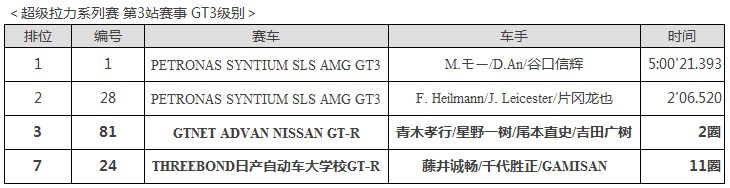 超級耐力房車賽第3站賽事在茂木賽道拉開帷幕,參加GT3級別賽事的#81“GTNETADVAN NISSAN GT-R”(青木孝行/星野一樹/尾本直史/吉田廣樹)最終勇奪第3名。