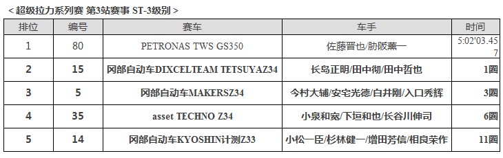 在有5輛FAIRLADY Z34參賽的ST-3級別賽事中,大部分賽車被卷入故障和事故中,一直保持穩(wěn)定節(jié)奏的#15“岡部自動車DIXCELチームテツヤZ34”(長島正明/田中徹/田中哲也)勇奪第2名,同一車隊的#5“岡部自動車MAKERSZ34”(今村大輔/安宅光德/白井剛/入口秀輝)最終奪得第3名。